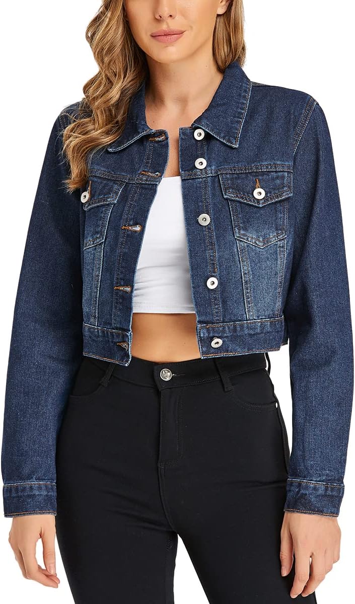PEIQI Women’s Cropped Jean Denim Jacket Button Down Long Sleeve with Pockets