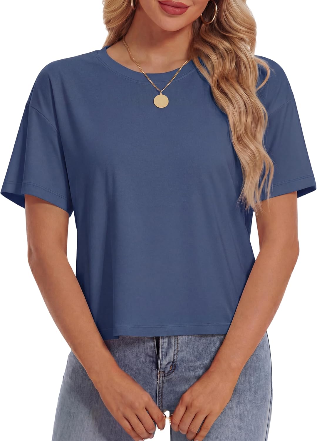YUCOLEN Women's Crop Tops Summer Short Sleeve Cotton UPF 50+ Round Neck Casual Loose Cropped T-Shirts Solid Basic Tees
