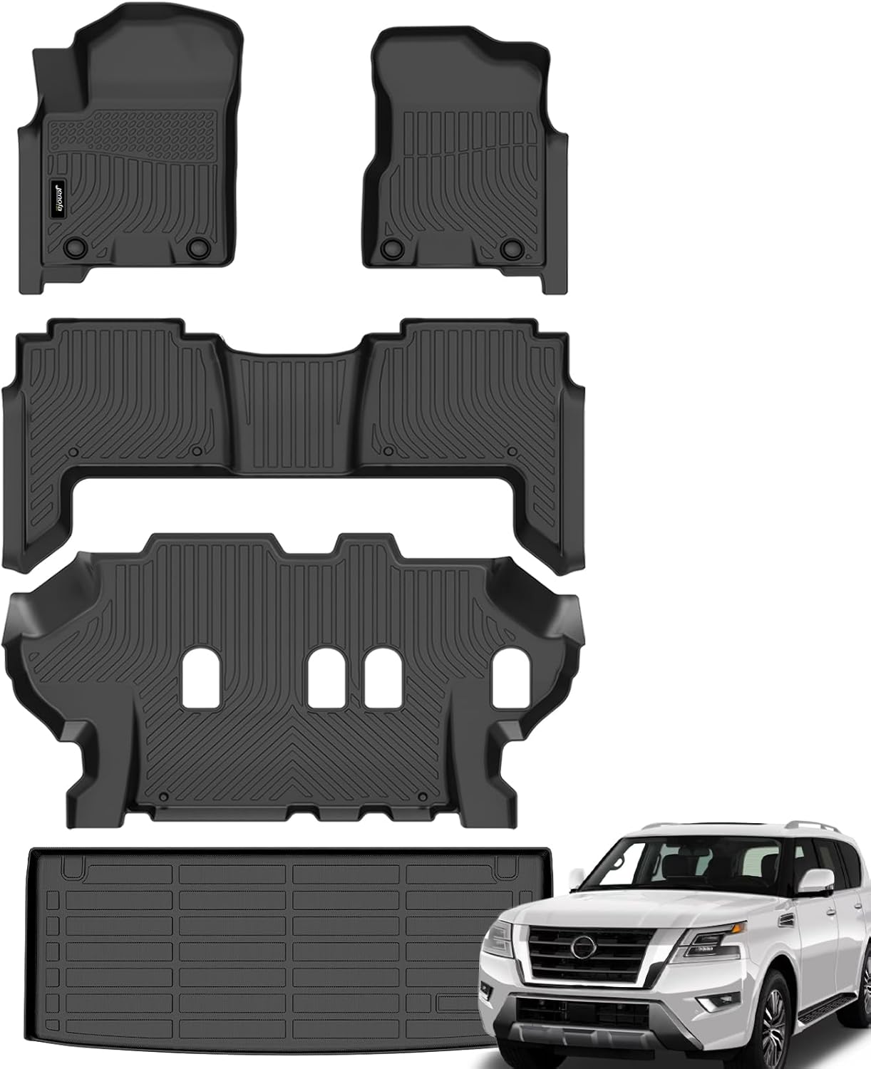 - Precise Fit: Jenofa Nissan Armada & Infiniti QX80 2019-2024 8 Seats floor mats kit included: 2*Front Mats - Driver side & Psaaenger side,1*Second row car mat,1*Third row Floor liner,1*Cargo mat.3D laser scanning technology ensures an exact match to Armada's original data, ensuring a comfortable fit and maximizing complete protection for your original car floor and cargo area.