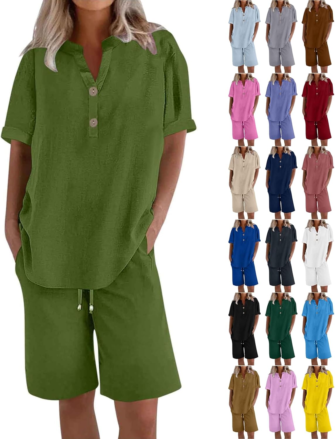 Linen Short Sets for Women 2 Piece Outfits Short Sleeve Button V Neck Shirts and Bermuda Short Sets Vacation Clothes