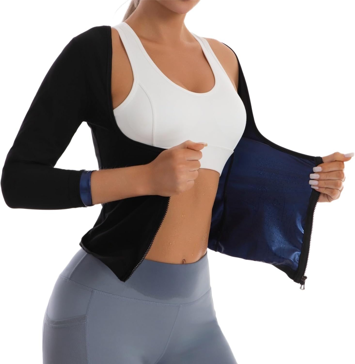 Sauna Suit Waist Trainer for Women, Sweat Sauna Shirt Zipper Long Sleeve Waist Trimmer Body Shaper Fitness Top