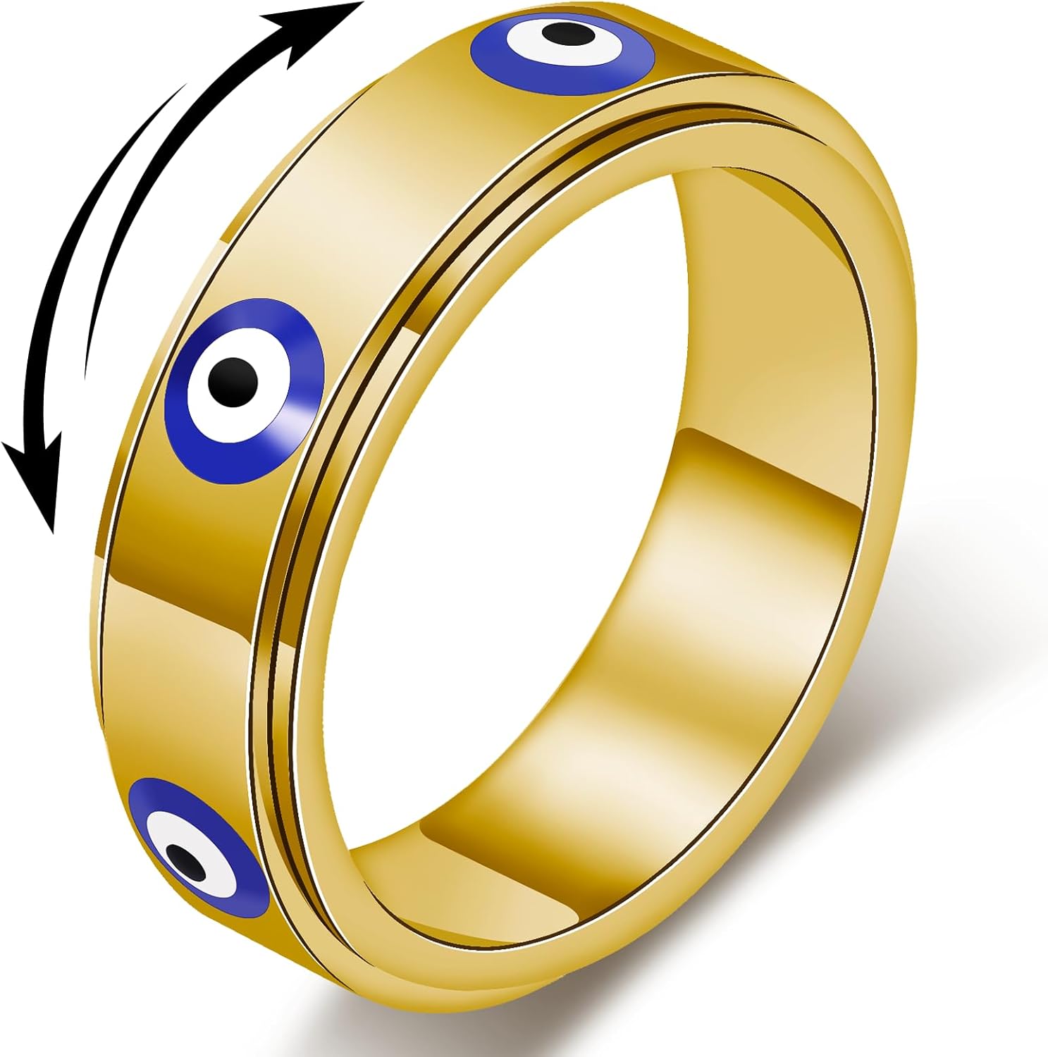 Evil Eye Fidget Ring for Women - 18K Gold Plated Stainless Steel Spinner Rings for Anxiety Relief, Ojo Turco Ring Luck Amulet, Turkish Faith Protection Stackable Jewelry Gift for Women Men
