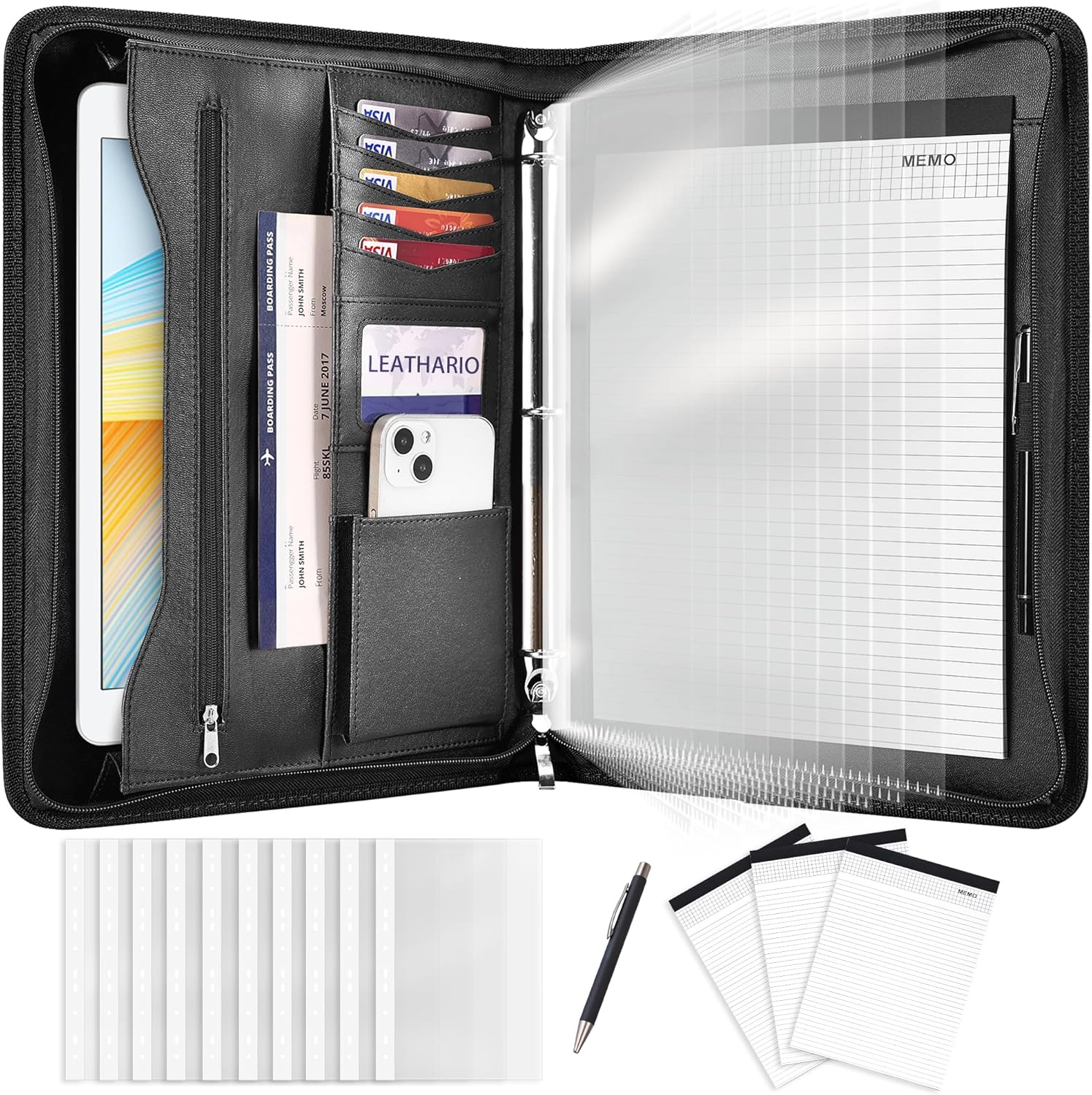 Leathario Portfolio Binder, Includes 10 Sheet Protectors and 3 Notepads, 3-Ring Folder Organizer, A4 Padfolio with Zipper, Vegan Leather Tablet Sleeve, Business Office Conference Clipboards