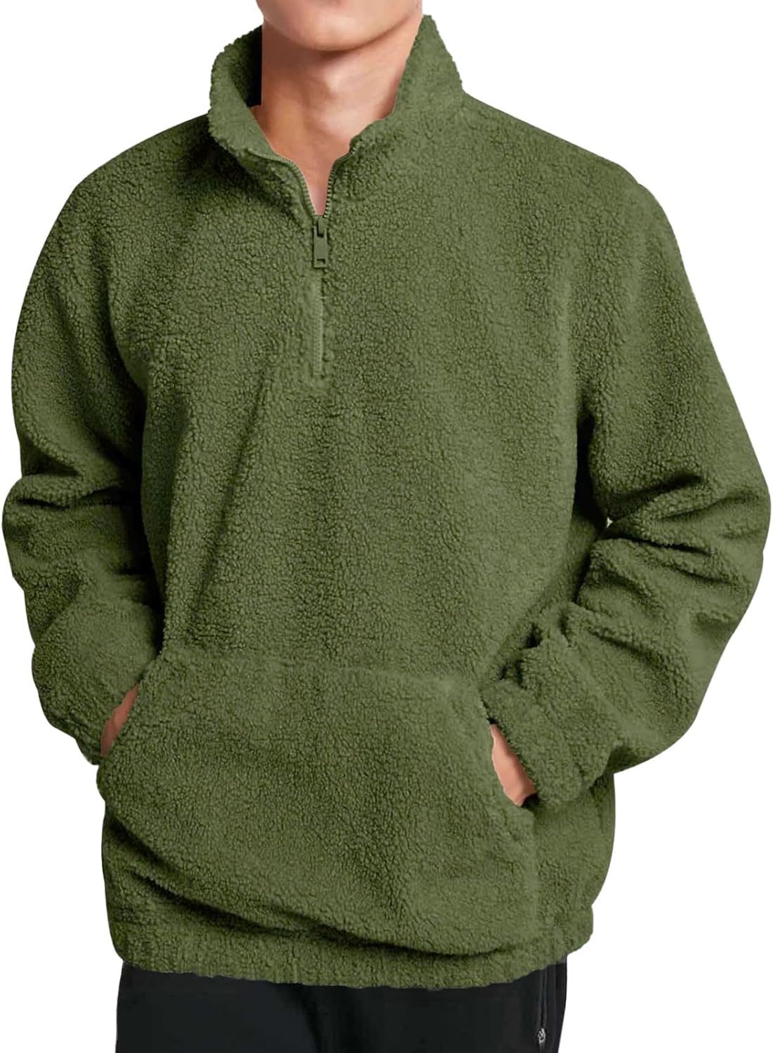 Runcati Mens Fuzzy Sherpa Sweatshirt Quarter Zip Fleece Pullover Winter Fall Warm Outerwear With Kangaroo Pocket
