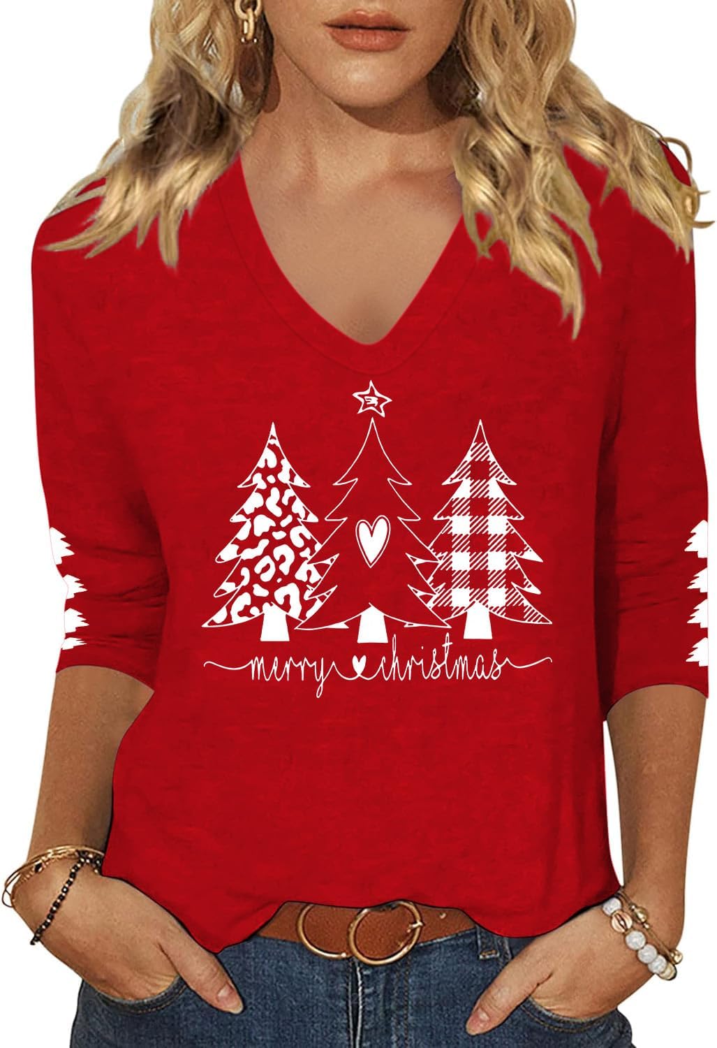 Casual 3/4 Sleeve V Neck Shirt for Women Funny Holiday Graphic Tee Fall Winter Loose Fit Tops