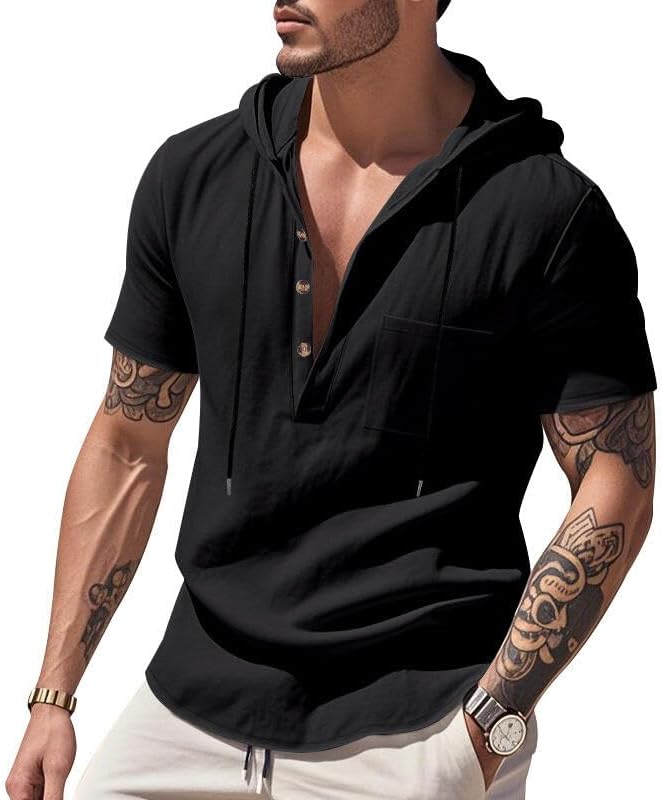 LIZALIG Men's Casual Linen Blend Shirt Short Sleeve Hooded Pullover 1/4 Button Henley Shirt for Vacation and Daily Wear