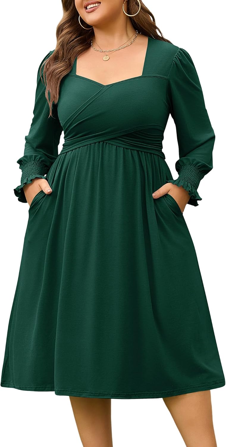 AMCLOS Women's Plus Size Casual Dress 2 Pockets Square Neck Back-Tie Crosswrap Bodice Elegant Work Business Long Sleeve