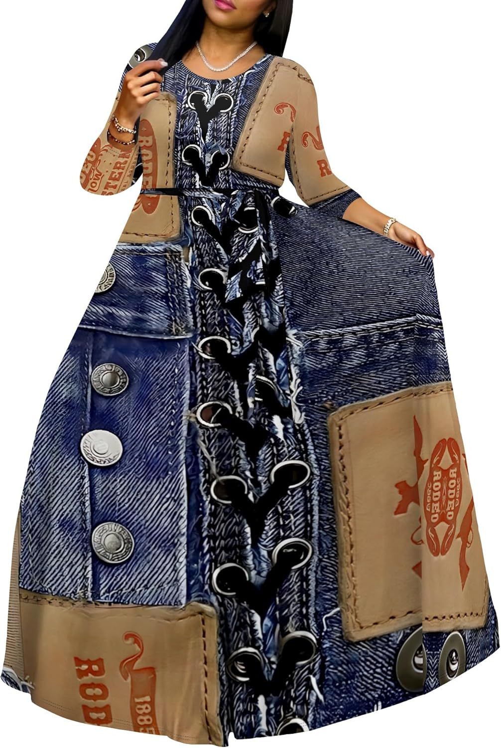 Plus Size Maxi Dresses for Curvy Women Casual 3/4 Sleeve Crewneck Floor Length Floral Print Dress with Belt
