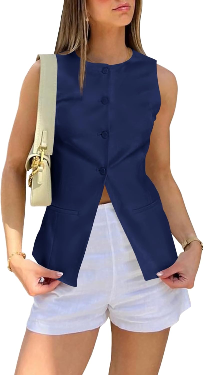 Cicy Bell Womens Round Neck Waistcoat Vest Summer Button up Vest Tops Casual Business Fitted Sleeveless Blazer