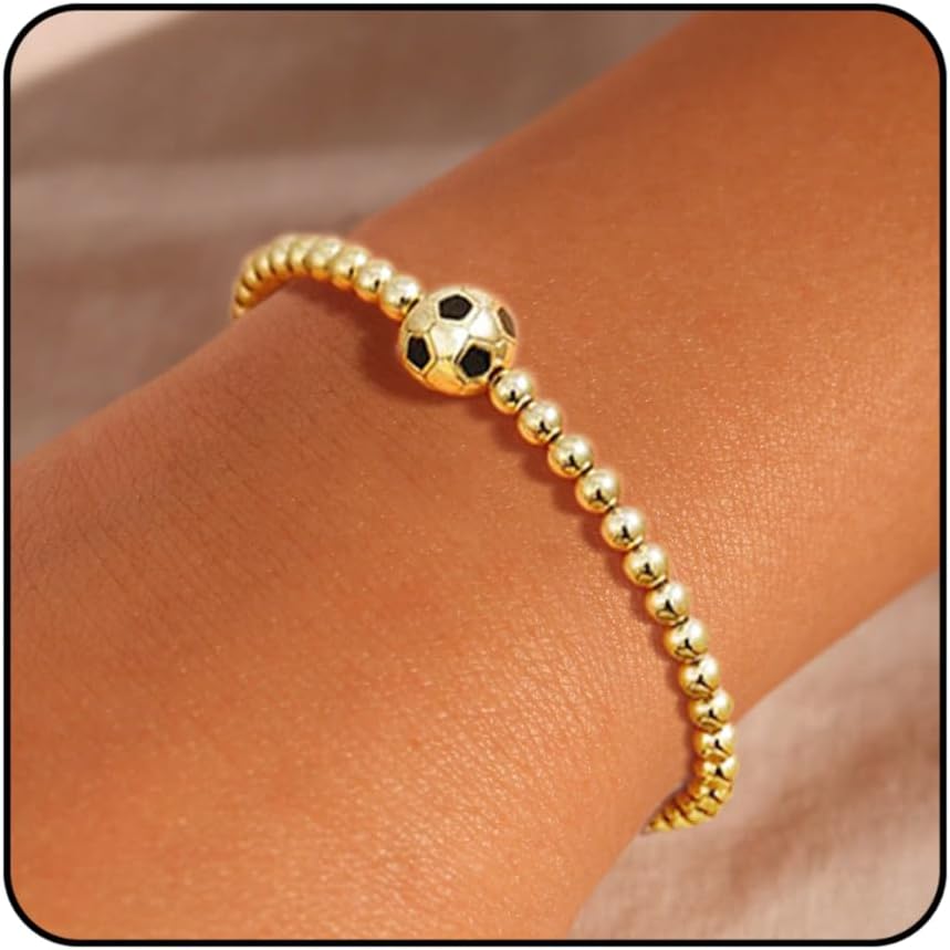 Gold Bracelets for Women, Football Baseball Rugby Basketball Volleyball Soccer Stackable Stretch Bracelets Dainty 14K Gold Plated Charm Beaded Bracelet Non Tarnish Jewelry Gifts for her
