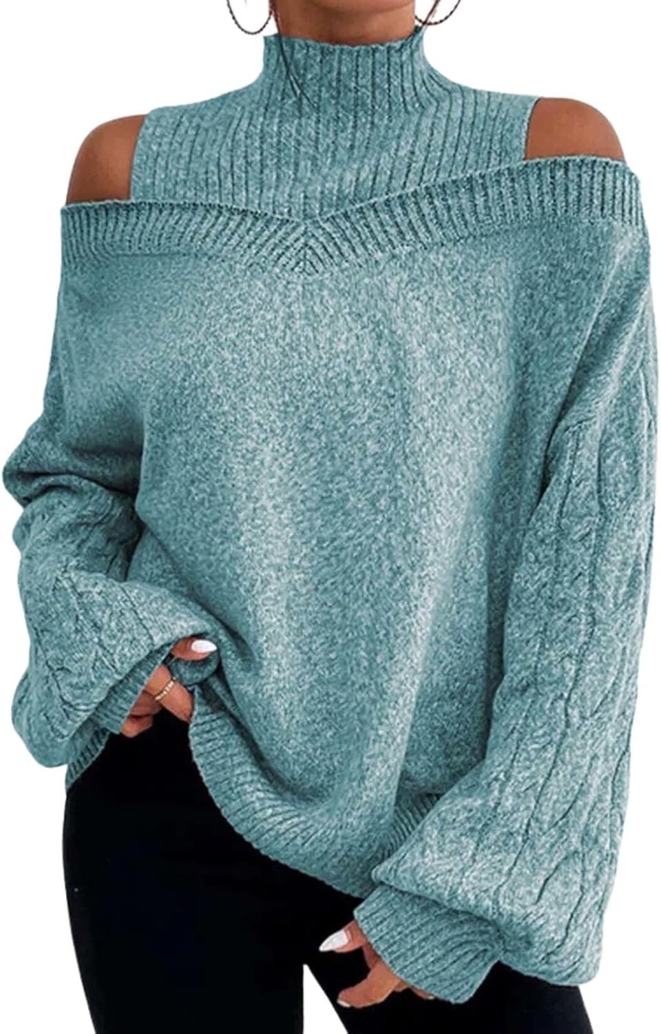 Turtleneck Sweaters for Womens Fall Fashion Casual Off The Shoulder Long Sleeve Solid Knit Pullover Sweater Top