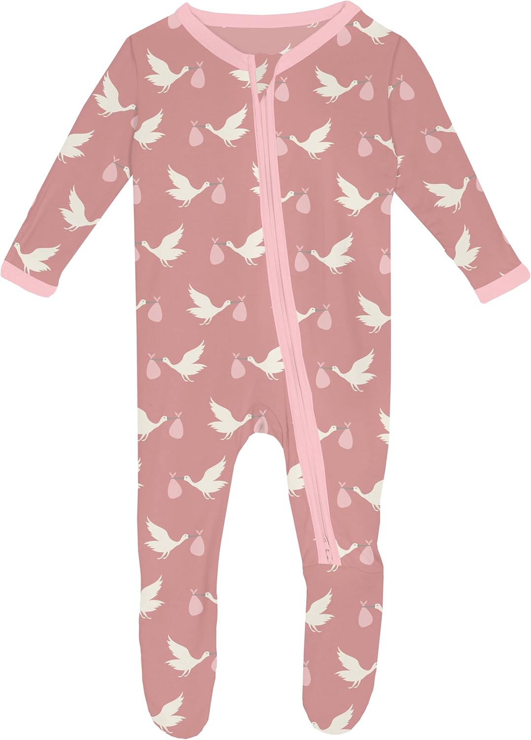 KicKee Welcome Home Zipper Footie – Viscose from Bamboo Baby Pajamas – One-Piece Sleepwear with Anti-Slip Feet & Zip Guard (Blush Stork - Newborn)