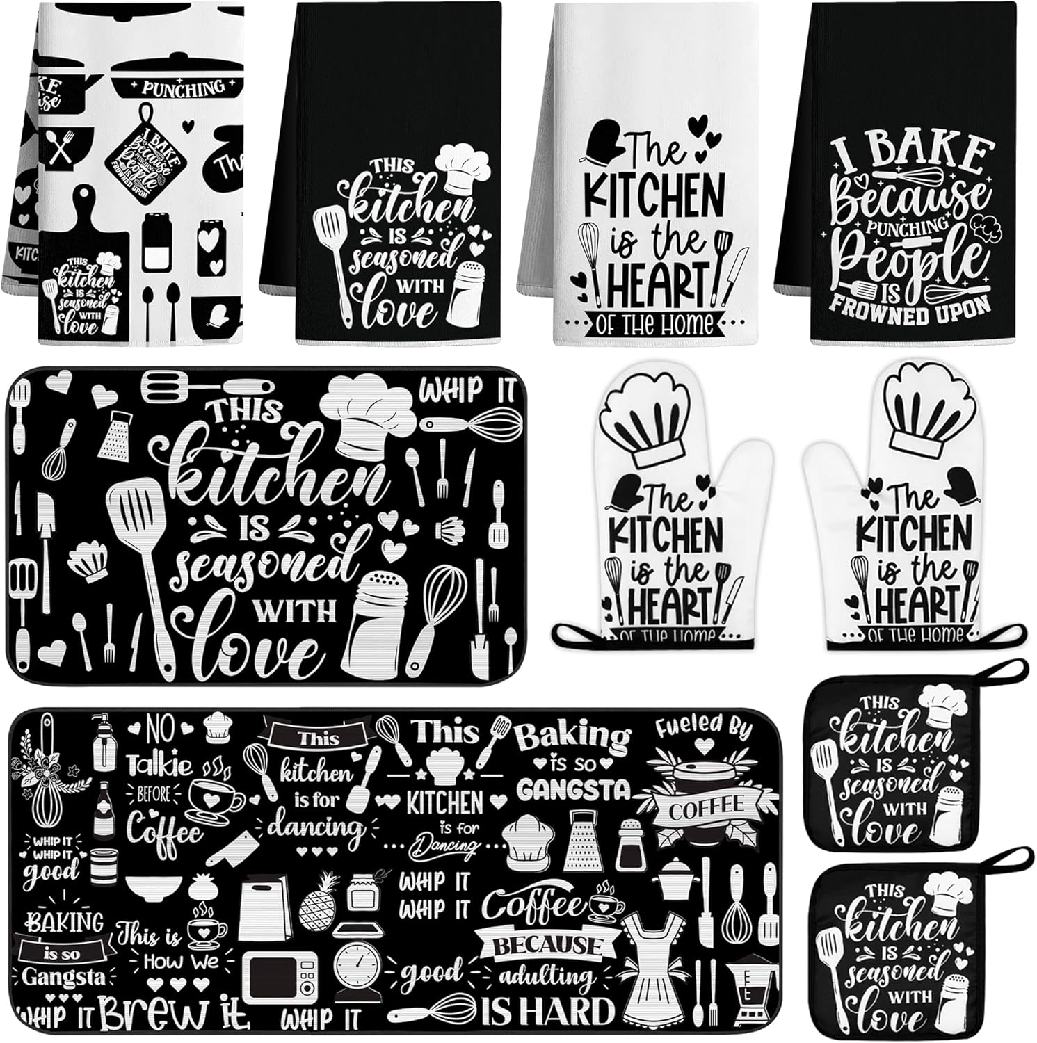 - 🍴 Value 10 Pcs Farmhouse Kitchen Set: the 10-piece kitchen decor set has many items you need: 4 Black and White kitchen towels, 2 kitchen pot holders, 2 kitchen rugs and mat for floor, 2 kitchen oven mitts. Perfect for kitchen and home daily use and ready to organize your space. Tip: If there are creases when you receive them, you can iron them to restore them