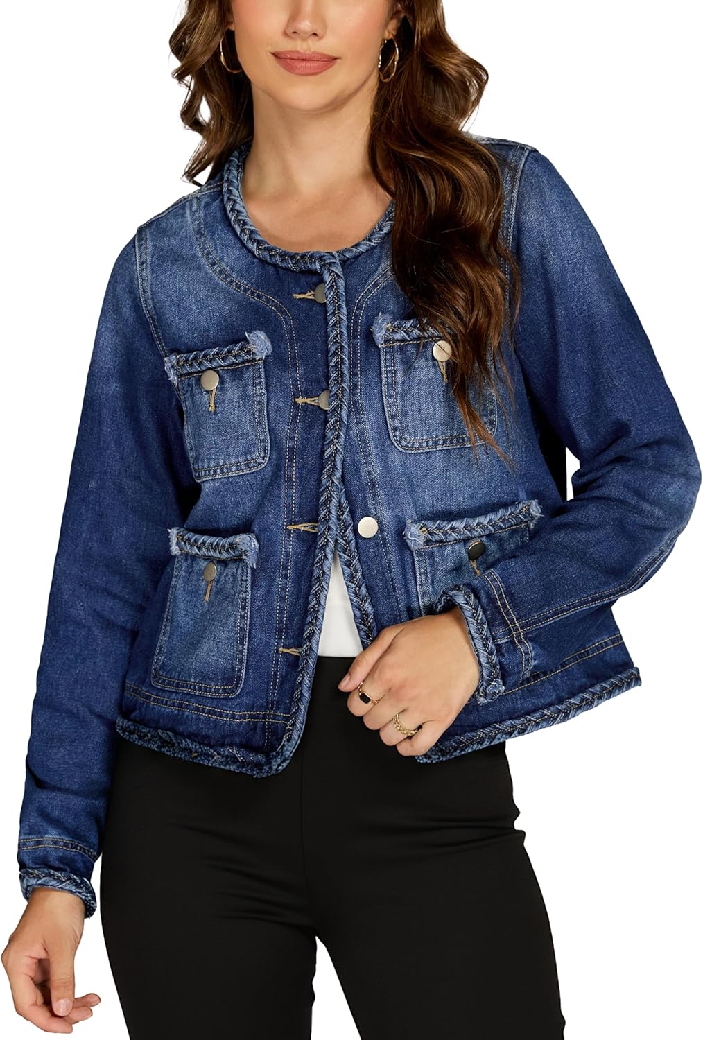 Ladyful Braided Trim Denim Jacket for Women Collarless Button Down Long Sleeve Cropped Jean Coat Outerwear