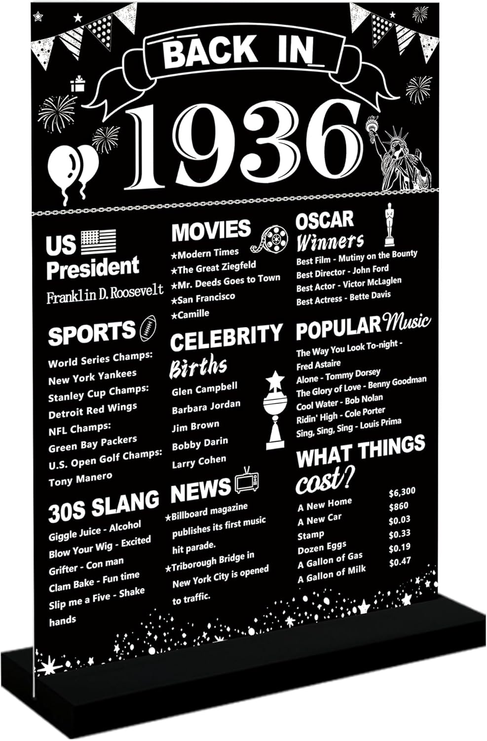DARUNAXY 90th Birthday Party Decorations, Black Back in 1936 Poster Acrylic Sign with Stand 90 Year Old Party Supplies for Men& Women Vintage 1936 Table Decor 90th Anniversary Class Reunion Gifts
