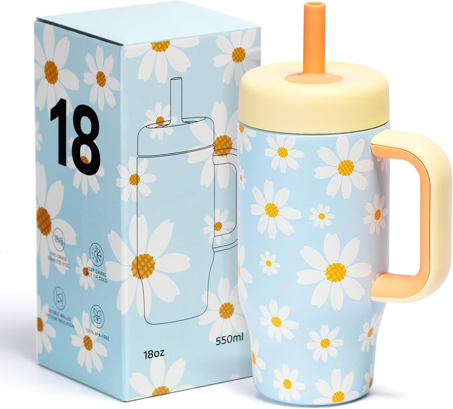 Stainless Steel Tumbler with Straw, Tumbler with Leak Proof, Reusable Double Walled Water Bottle, Thermo Coffee Travel Mug (Flower, 540ml)