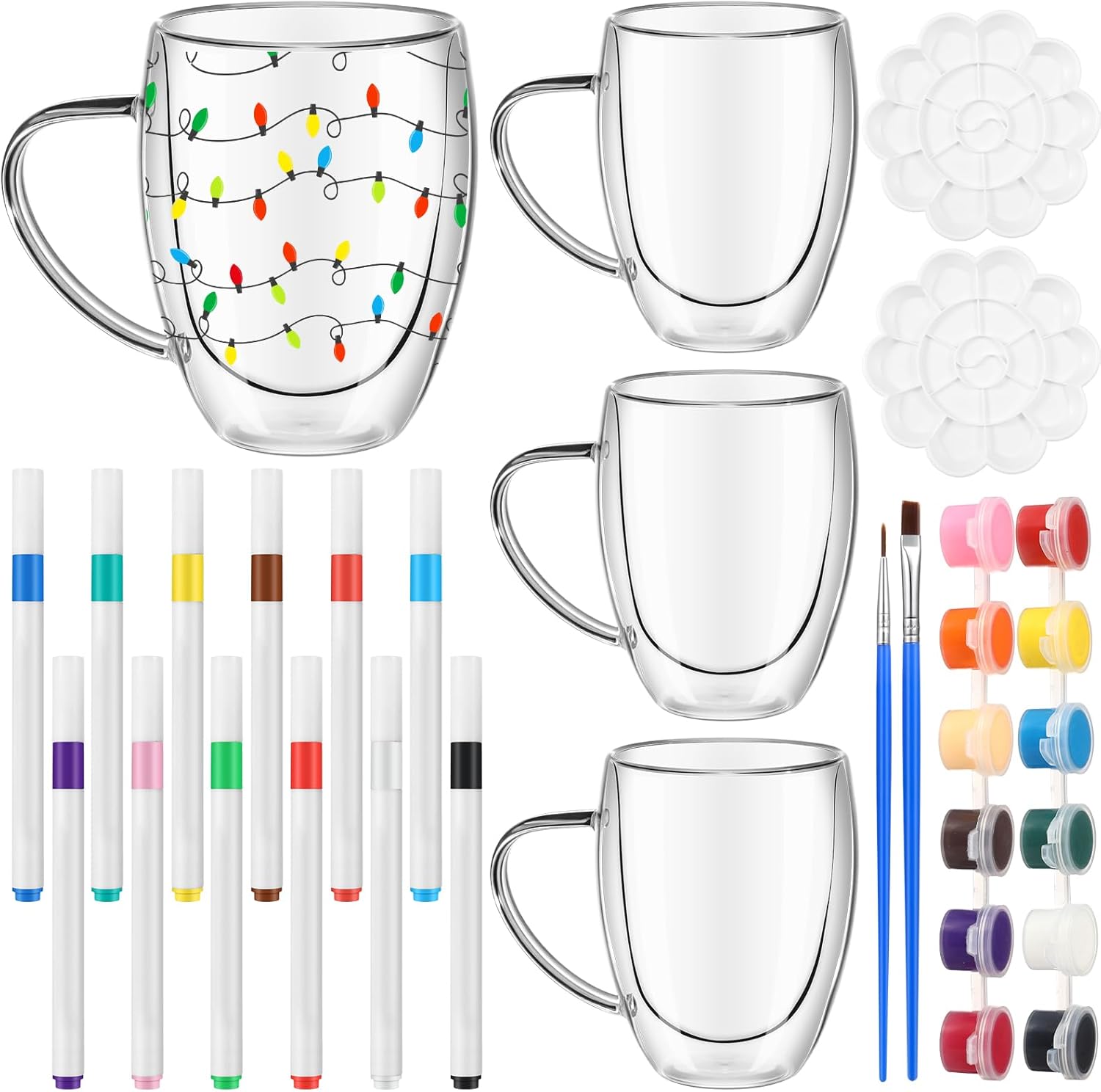 - DIY Glass Cup Painting Kit: this DIY glass cup painting kit includes 4 blank transparent coffee cups, 4 paintbrushes, 2 boxes of 12 color markers, 2 packs of 12 color acrylic paints and 2 palette trays; You can use these painting supplies to color the cups as needed and create your mugs