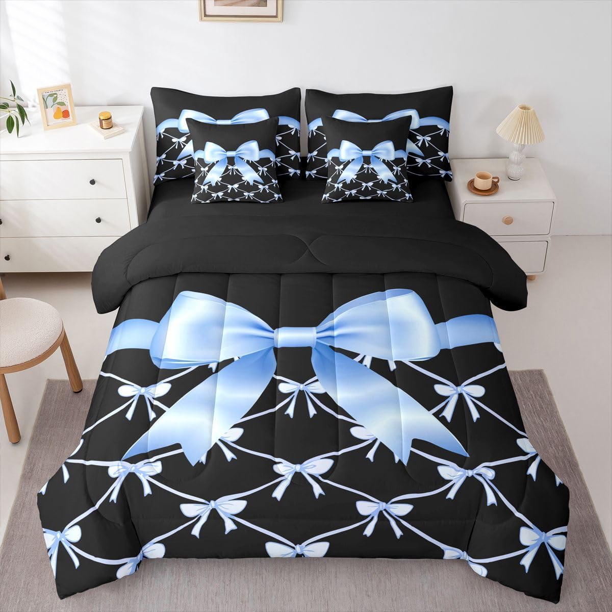 Feelyou Blue Bow 7 Piece Bedding Set Cute Ribbon Bow Comforter Set with Sheets for Kids Boys Girls Black Blue Bed in a Bag Princess Style Bed Set Soft Lightweight