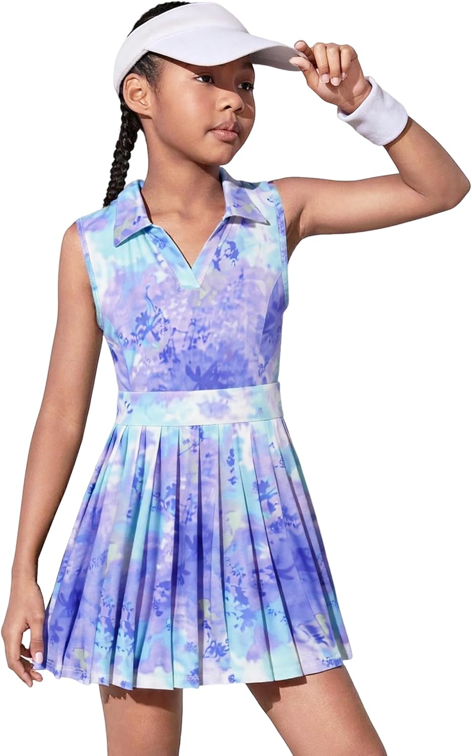 JiAmy Girls Tennis Dress Sleeveless Polo V Neck Athletic Dress Cutout Back Printed Pleated Girls Golf Dresses 3-12 Y