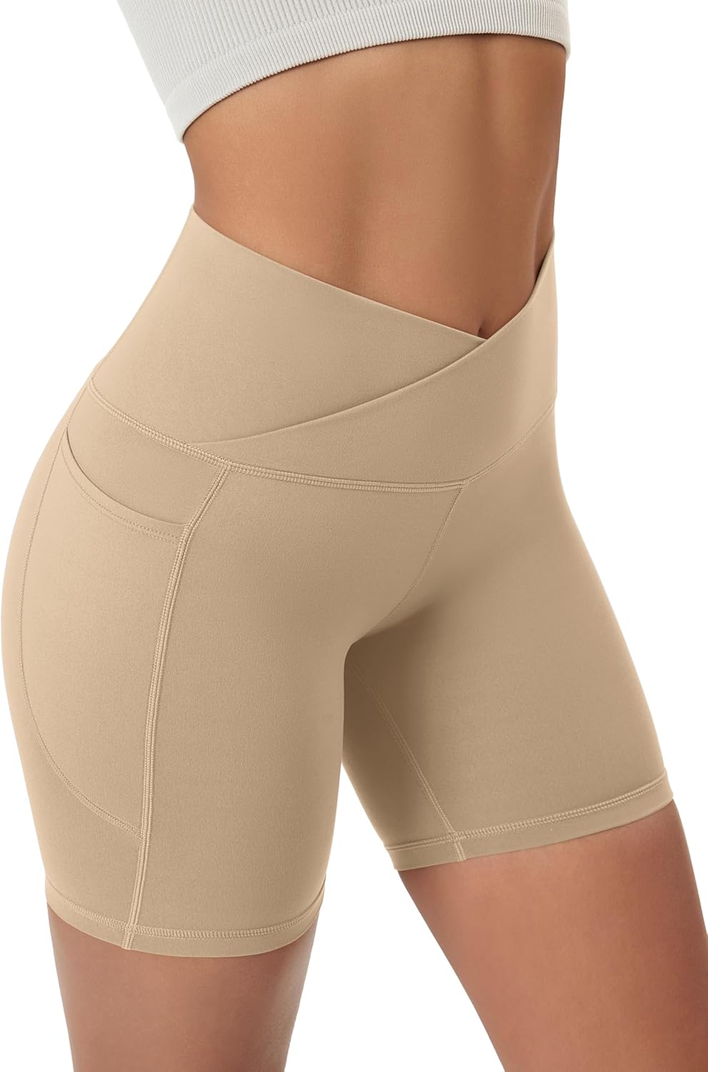 ODODOS Cloud Feeling Cross Waist Yoga Shorts with Pockets for Women, 6" Crossover High Waist Lounge Biker Shorts