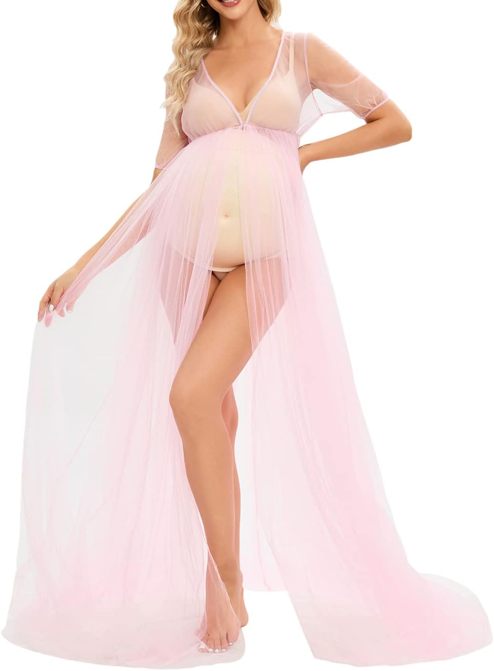 ZIUMUDY Maternity See Through Tulle Split Front Dress for Photoshoot Photography Short Sleeve Sheer
