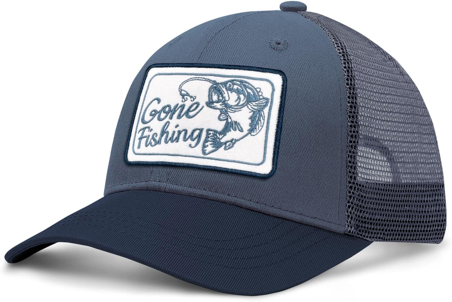 Fishing Gifts for Men Fishing Hat Embroidered Bass Fish Patch, Cotton, Blue, Trucker Hat