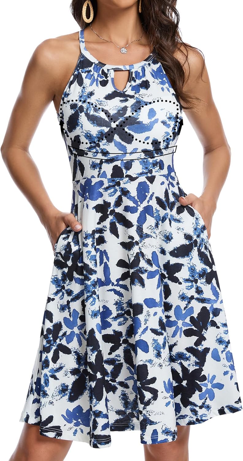 JOYSHAPER Built in Bra Summer Dress Casual Beach Sundress Flowy Halter Dress with Pockets