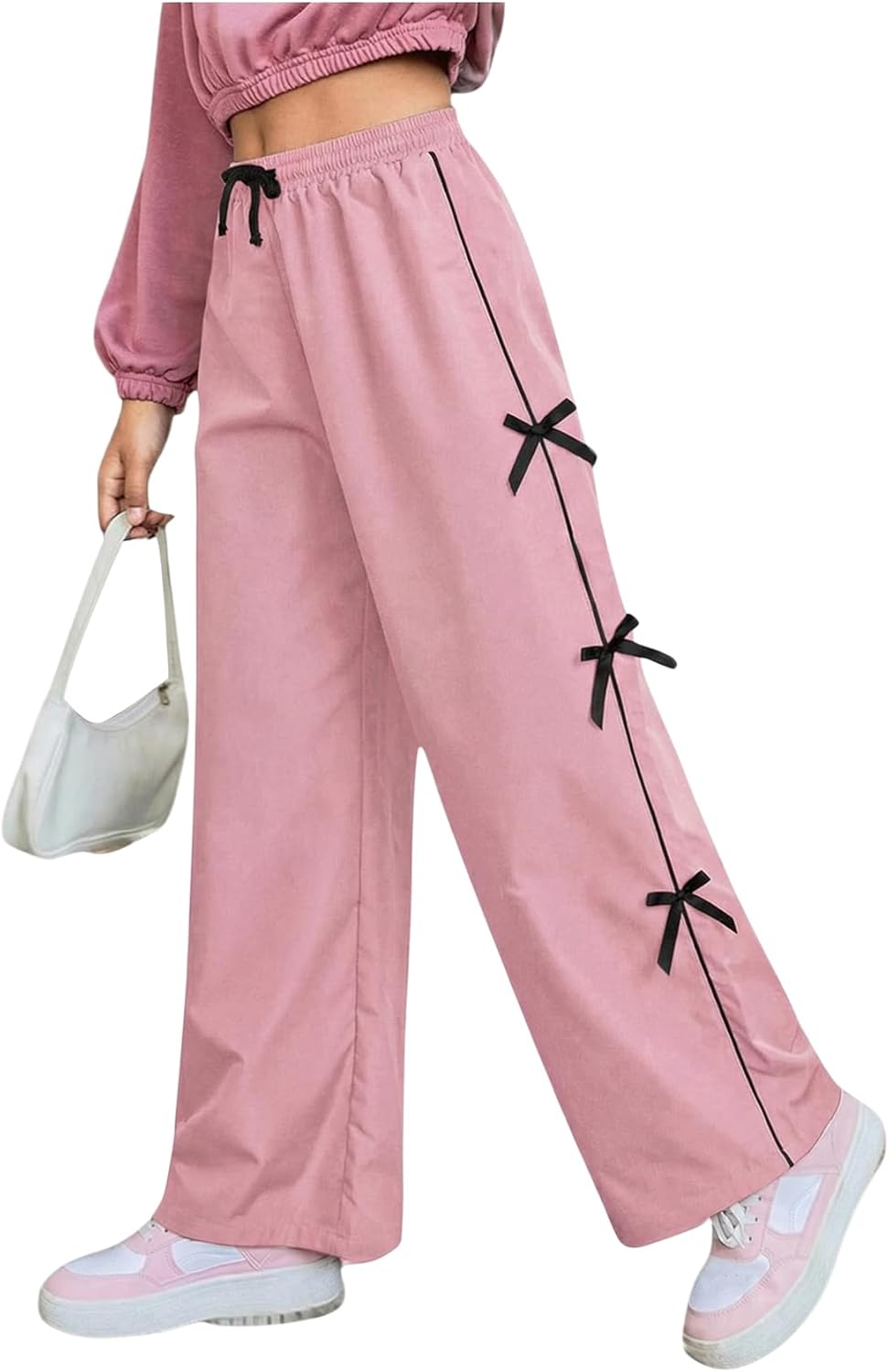 WDIRARA Girl's Bow Side Waist Track Pants Cute Wide Leg Trousers
