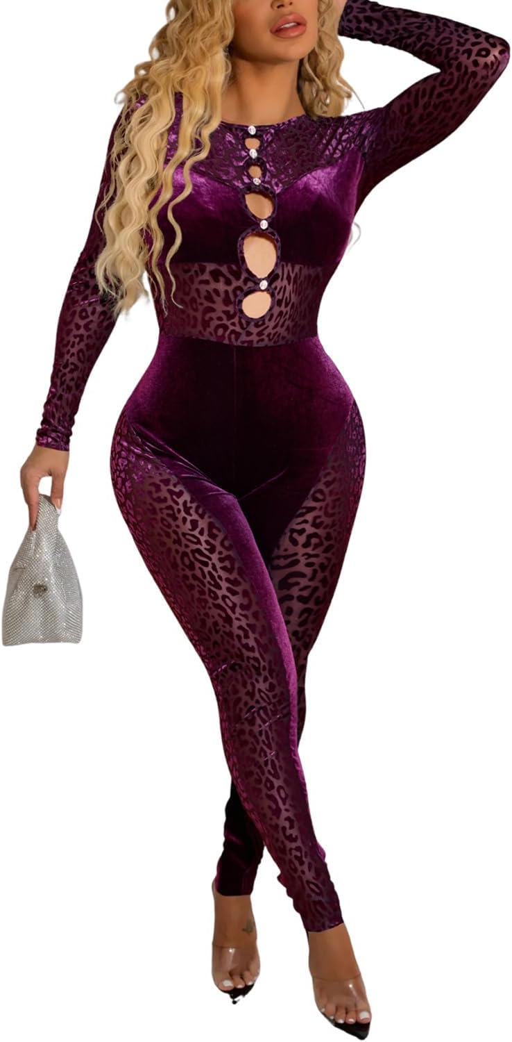 Uni Clau Women Sexy Mesh Patchwork Jumpsuit One Piece Hollow Out Outfits Long Sleeve Velvet Leopard Club Bodycon Jumpsuit