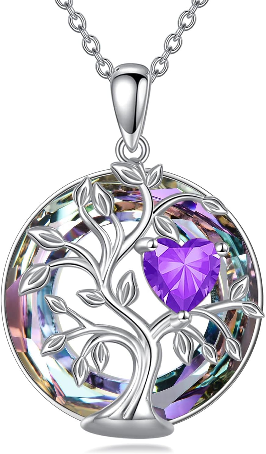 Tree Of Life Birthstone Necklace 925 Sterling Silver Crystal Family Tree Pendant Necklaces Heart Birthstone Jewelry For Women Female Anniversary Birthday Gifts