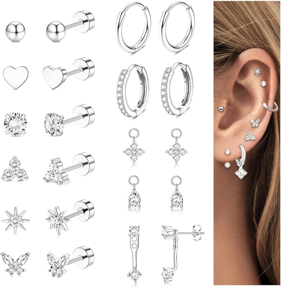 Gold Plated Flat Back Stud Earrings for Women Trendy Stacks Hypoallergenic Surgical Steel Stud Hoop Earrings Set For Multiple Piercing Stainless Steel Cartilage Screw Back Earrings Jewelry Gifts
