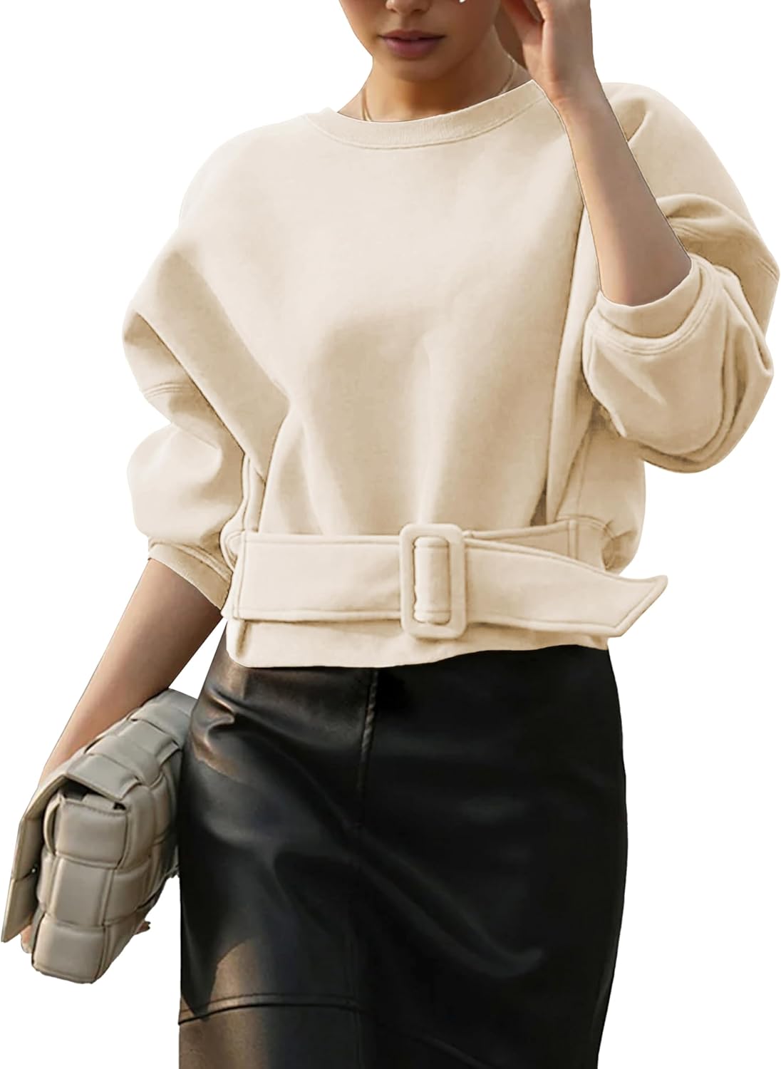 Womens Long Sleeves Cropped Sweatshirts Belted Lace Up Tops Crewneck Y2K Pullover 2025 Fall Outfit