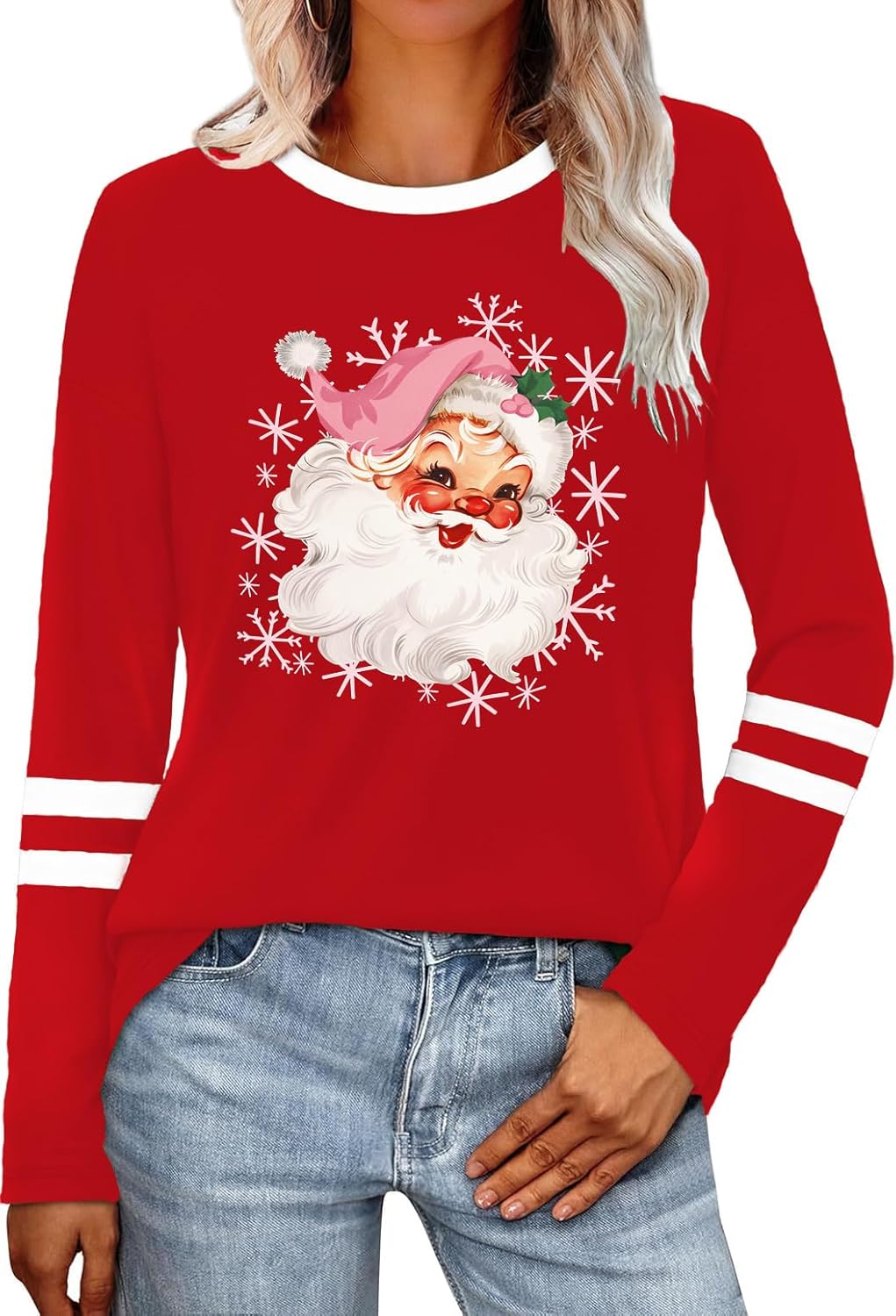 Christmas Shirts for Women Funny Santa Claus Snowflake Long Sleeve Tops Cute Xmas Holiday Blouse