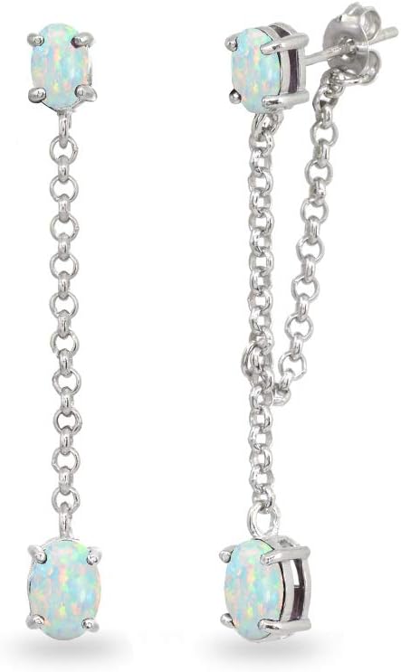 Sterling Silver Genuine or Synthetic Gemstone Oval Two Stone Bezel-Set Chain Drop Dangle Earrings for Women