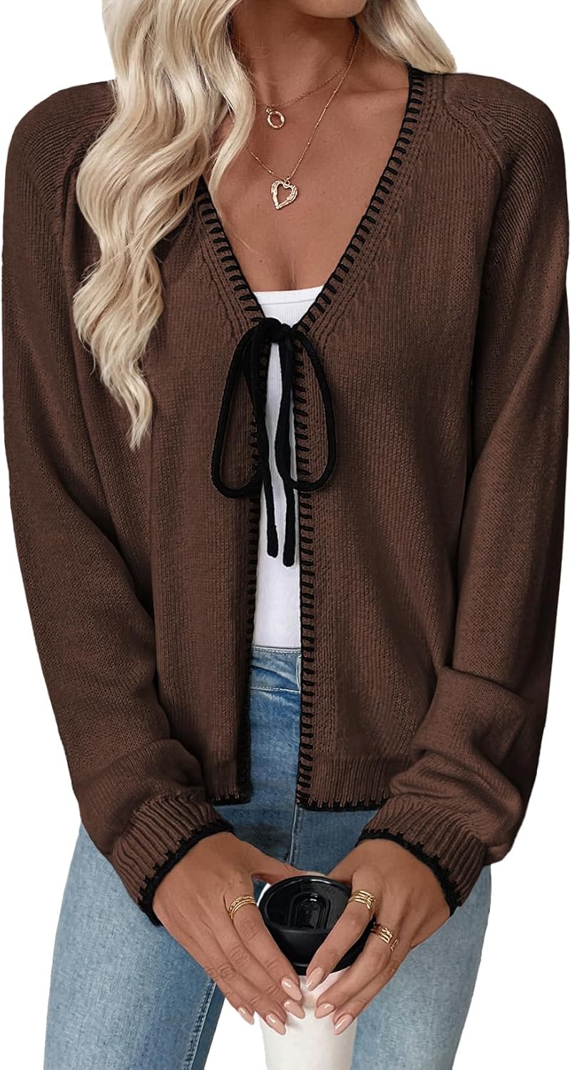 EVALESS Womens Cardigan Sweaters Trendy V Neck Long Sleeve Open Front Bow Tie Knit Chunky Lightweight Fall Outerwear