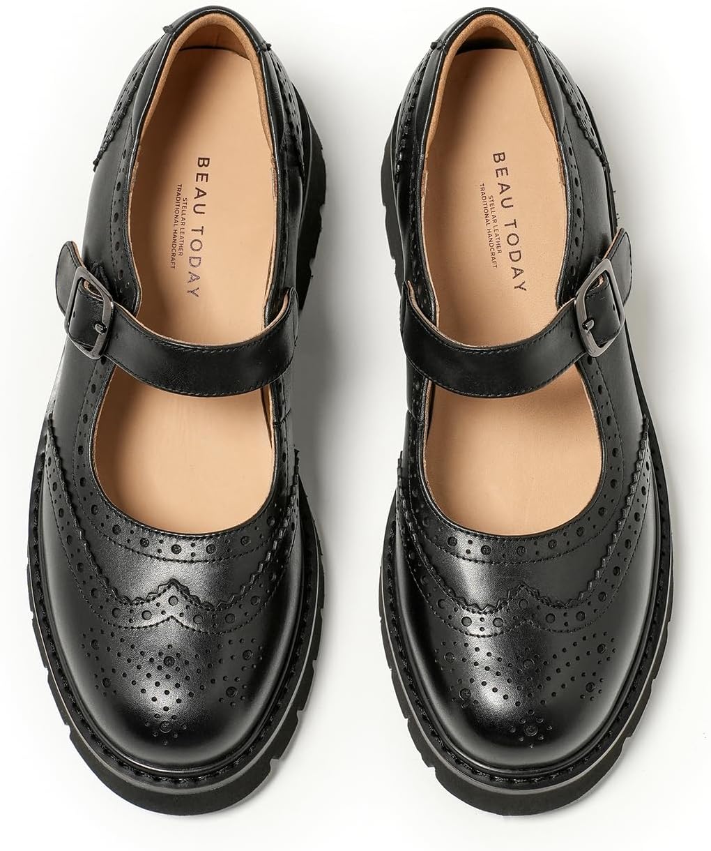 BEAU TODAY Mary Jane Shoes Women Mary Jane Flats Womens Oxford Wingtips Comfort Leather Round Toe Brogue Non-Slip Dressy Casual Cute Girls School Work Shoes