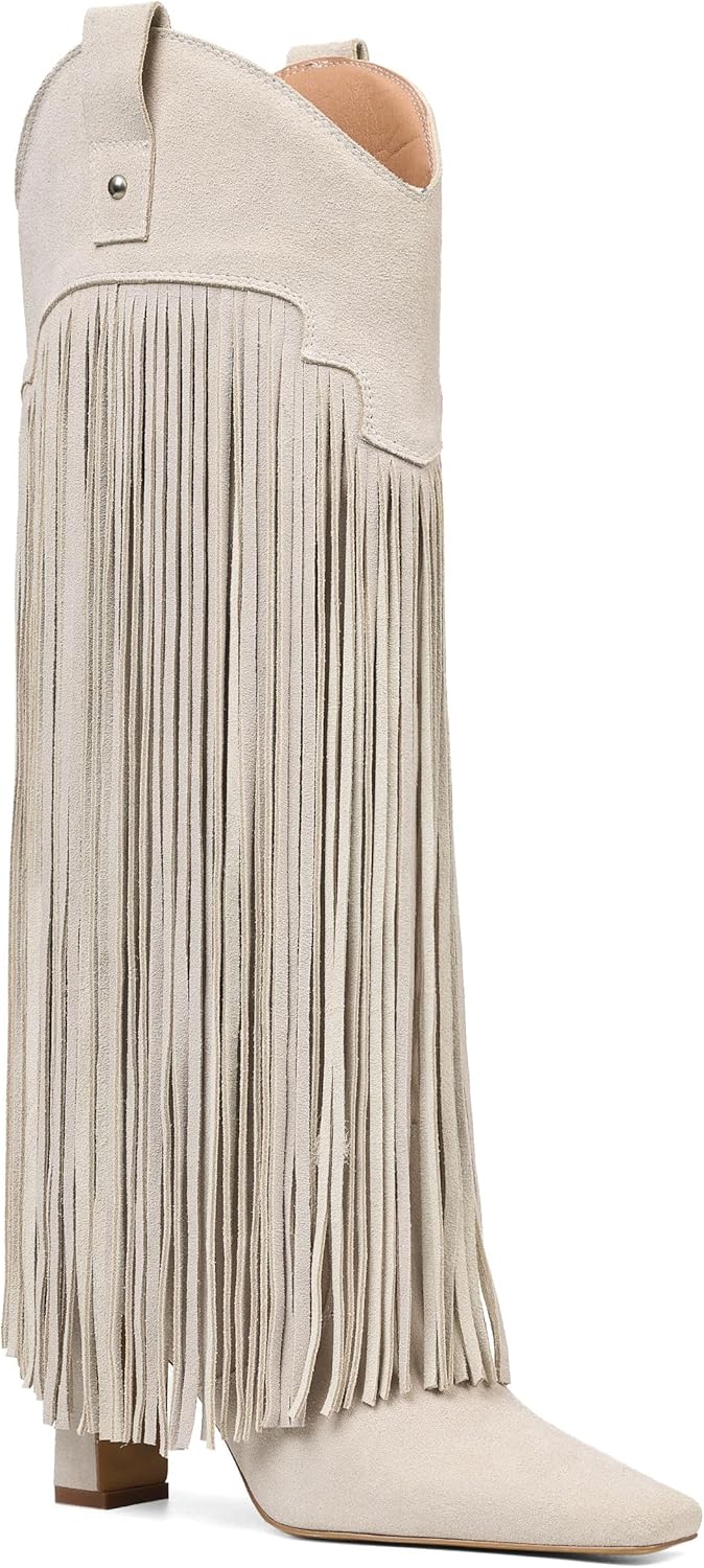 Mattiventon Knee High Boots for Women Fashion Fringe Boots with Square Toe Chunky Heel Pull On Suede Tall Boot for Party Dating