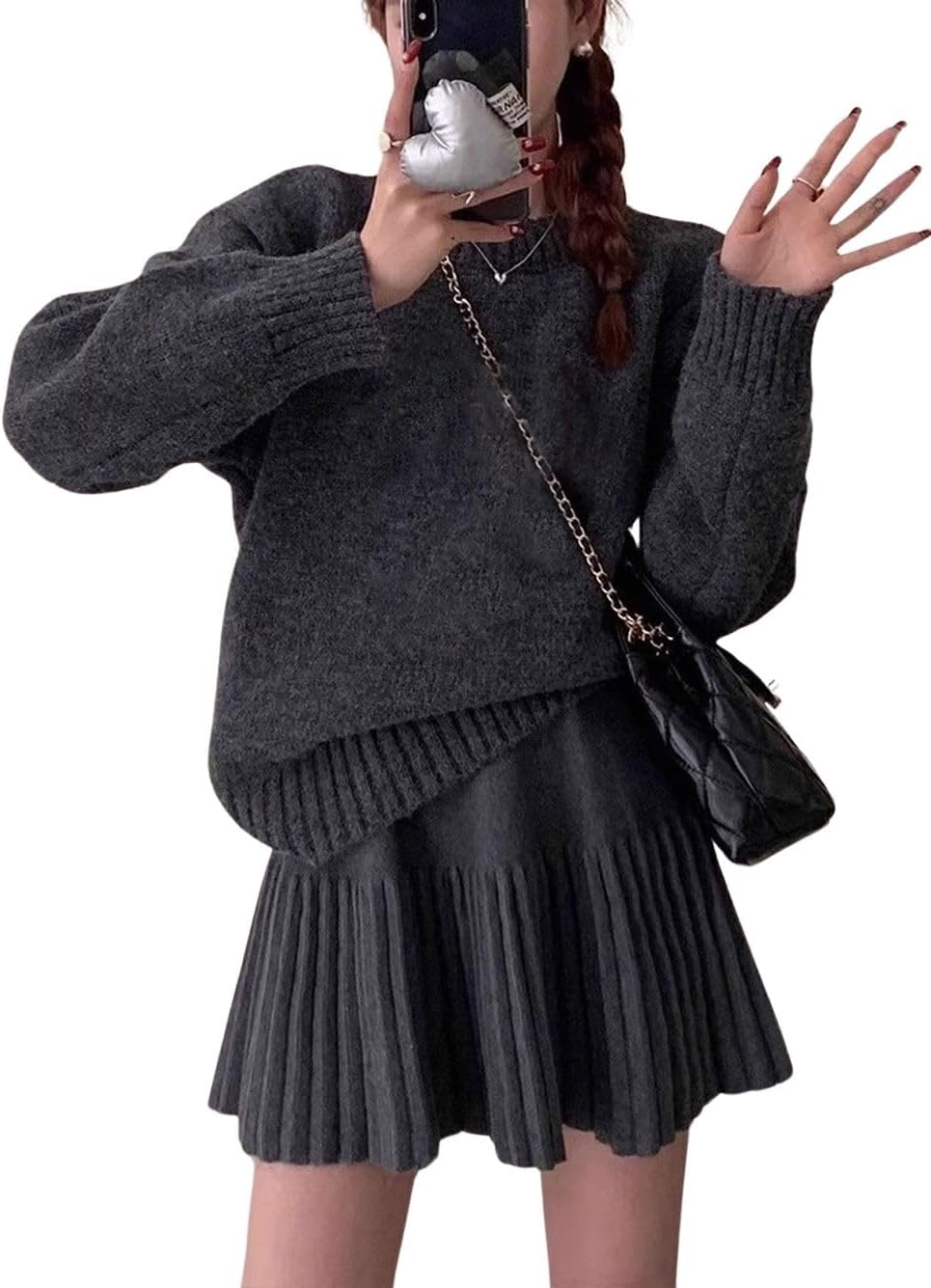 CHARTOU Women Sweater Skirt 2 Pieces Outfits Oversized Pullover Sweater and Pleated Mini Skirt