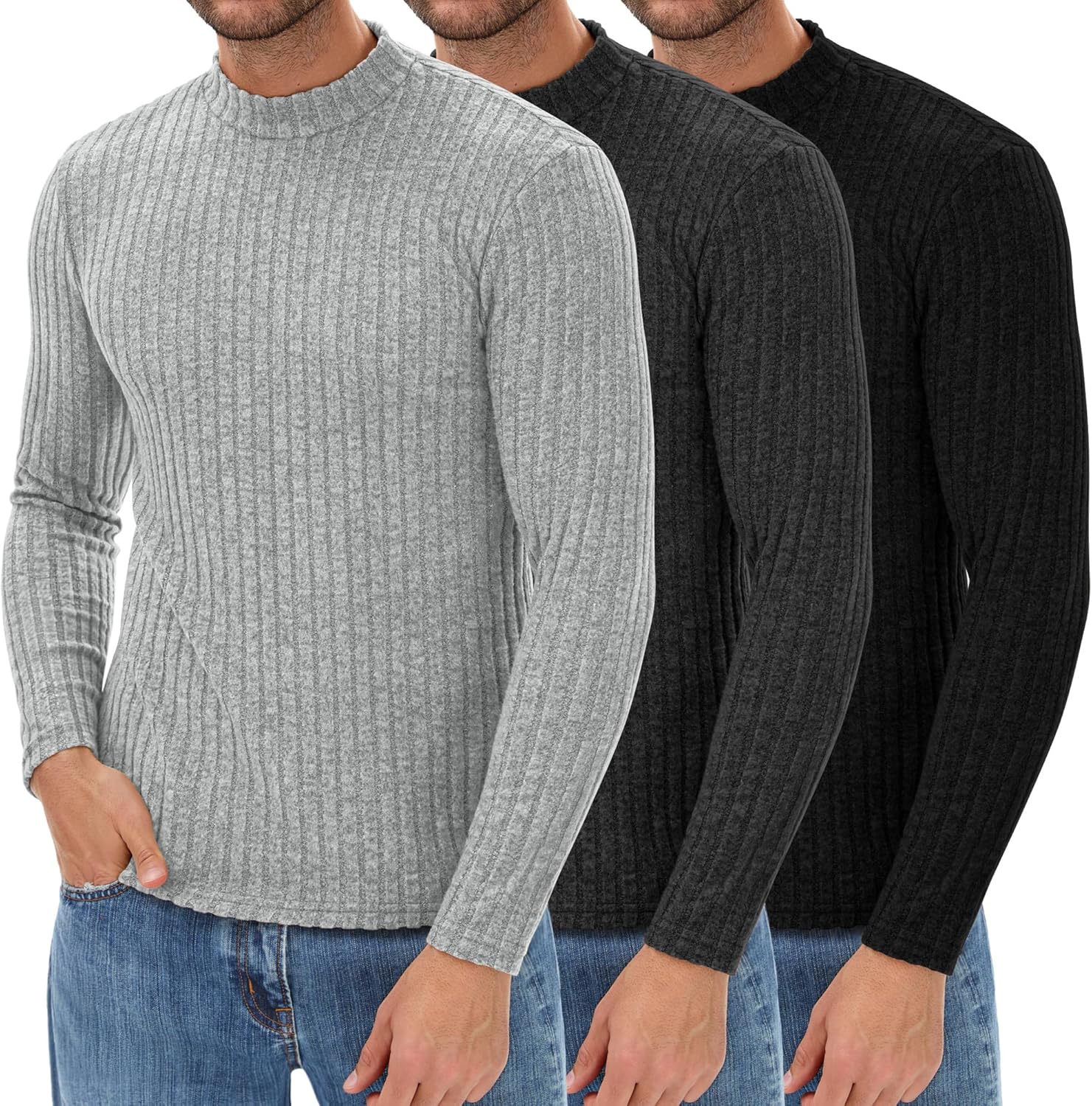3 Pack Men's Mock Turtleneck Sweaters Long Sleeve Ribbed Knit Shirts Slim Fit Casual Pullover Lightweight Layer