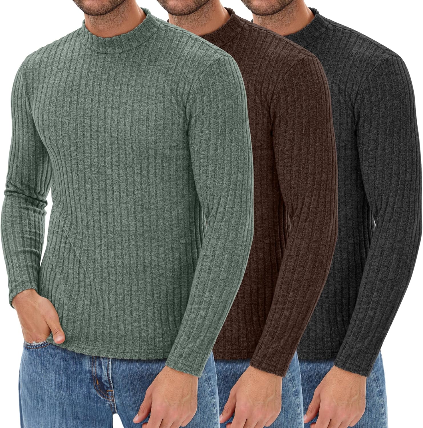 3 Pack Men's Mock Turtleneck Sweaters Long Sleeve Ribbed Knit Shirts Slim Fit Casual Pullover Lightweight Layer