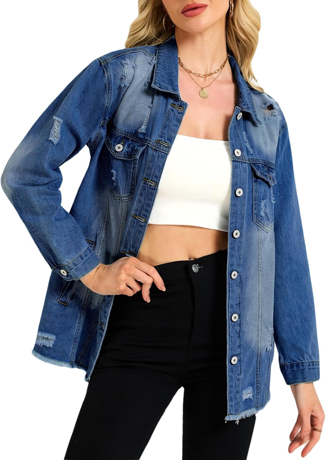 LifeShe Women’s Distressed Denim Jacket Long Sleeve Ripped Jean Coat with Frayed Hem, Casual Loose Fit Button Down Outerwear
