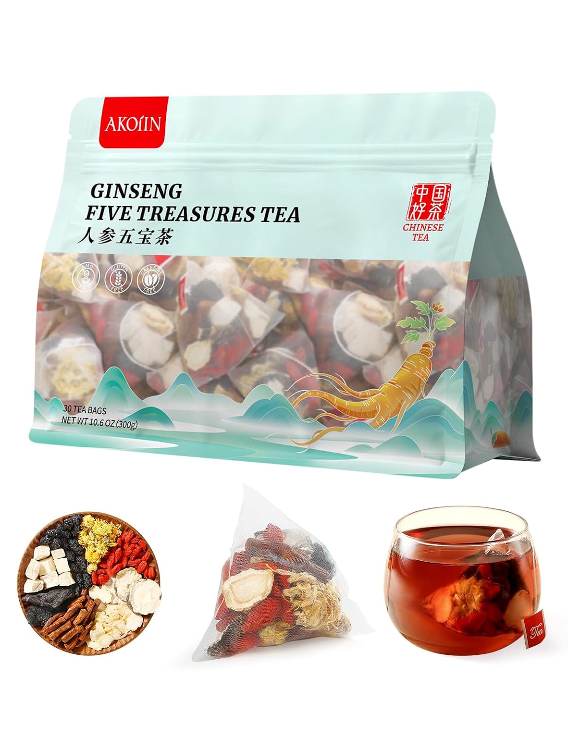 Ginseng Five Treasures Tea - 30 Bags, Caffeine-Free, Pure Herbal Blend with 8 Traditional Chinese Herbs Kidney Tea, Gentle Energy & Focus for Men and Women
