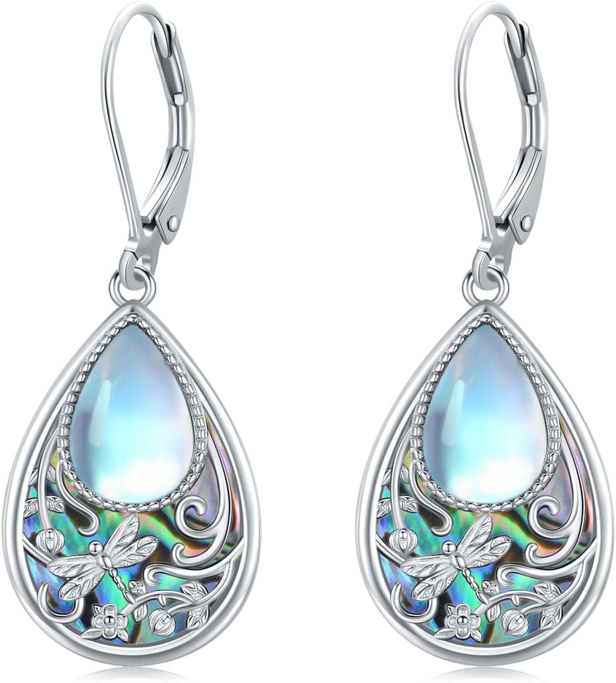 Dragonfly Filigree Earrings 925 Sterling Silver Teardrop Moonstone Abalone Shell Dangle Drop Earrings Filigree Jewelry Gifts for Women