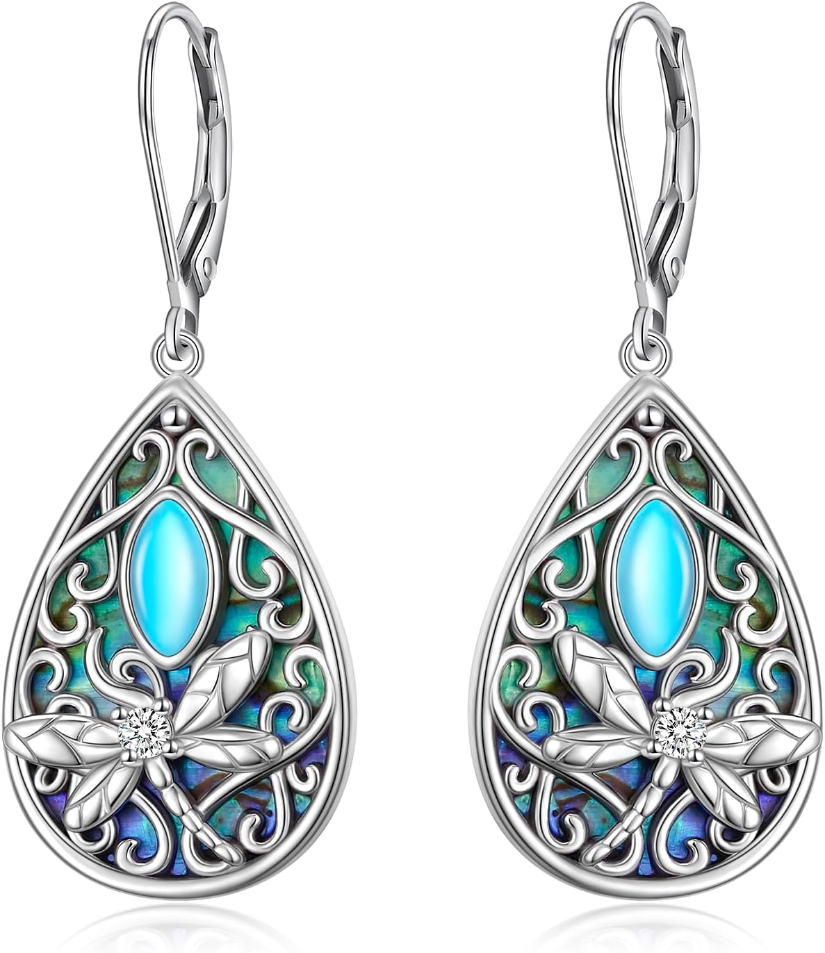 Dragonfly Filigree Earrings 925 Sterling Silver Created Abalone Shell Moonstone Teardrop Dangle Jewelry Birthday Mother’s Day Gifts for Women