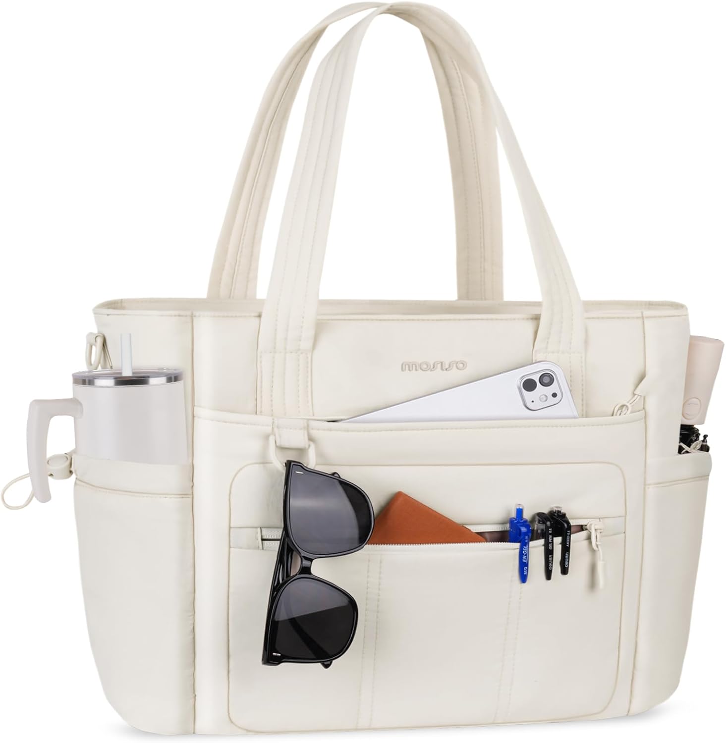 MOSISO Laptop Tote Bag for Women, Puffy Lightweight Work Tote Bag with Laptop Compartment & Trolley Belt, 15.6 inch Large Capacity Handbag Shoulder Bags for College Teacher Work Office Nurse, Beige