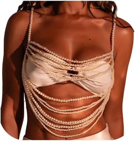 White Pearl Vest Harness Bra Chain Jewelry Multilayered Beads Chest Chain Festival Rave Pearl Lingerie Chain Body Jewelry for Women