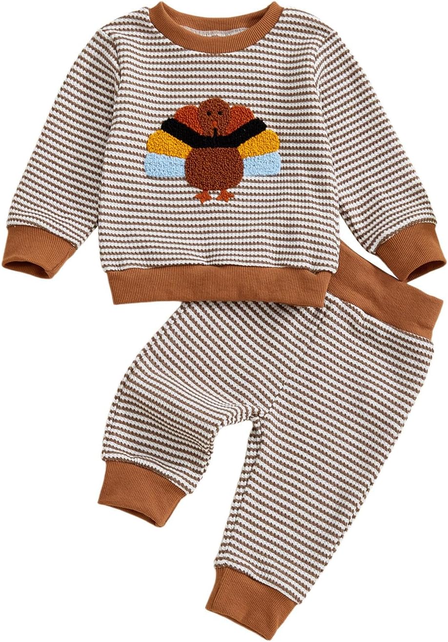 Toddler Baby Boy Girl Thanksgiving Outfit Turkey Embroidery Stripe Long Sleeve Waffle Knit Sweatshirt and Pants Set