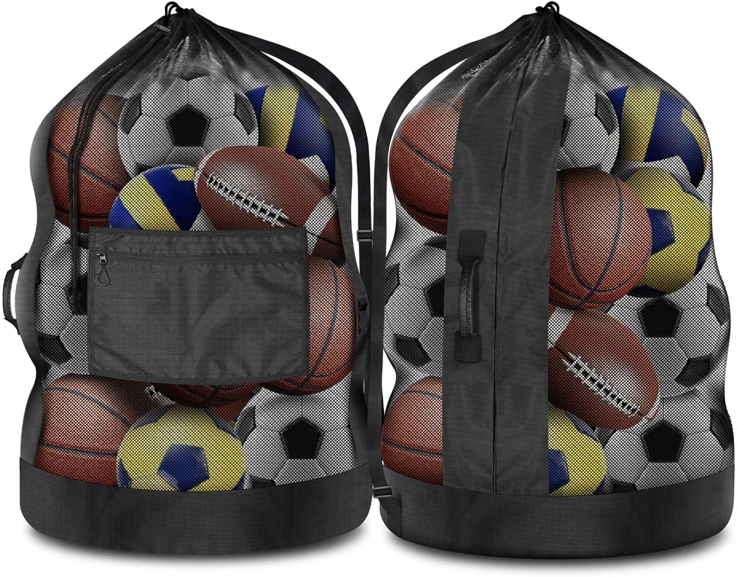- EXTRA BASKETBALL BAGS FOR TEAM BALLS: Measured at 40" x 30". It holds team jersey, practice balls, even water sports gear and laundry. Can hold 12 soccer balls (size 5), 15 footballs, 12 ugby balls or 8 basketballs. It is the one giant athletic ball bag mesh you will ever need for all your sports and outdoor events.