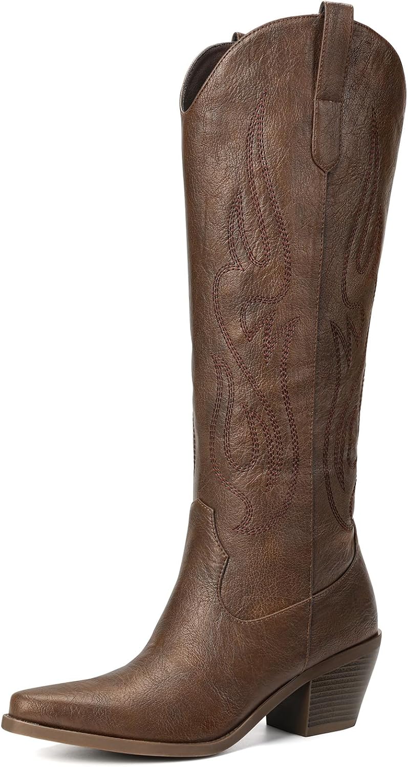 Pasuot Western Cowboy Boots for Women - Knee High Wide Calf Cowgirl Boots, Slip On Pointed Toe Chunky Heel Fashion Retro Classic Pull On Tall Boot for ladies Party concert
