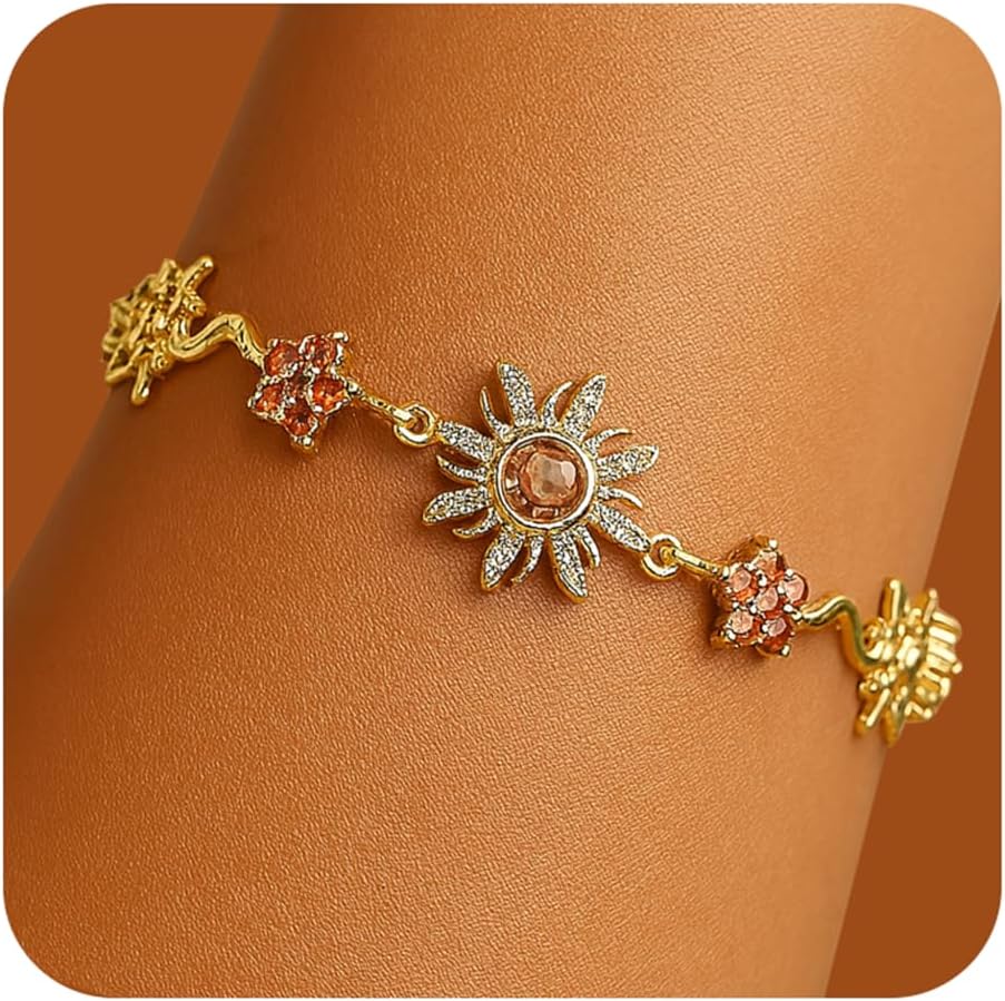Gold Silver Sun Link Bracelet for Women, Dainty Sparkly Colorful Crystal Rhinestone Flower Floral Adjustable Chain Bracelets Prom Wedding Accessories Fashion Jewelry Gift